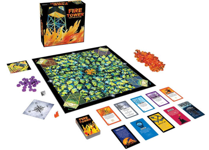 While manning your fire tower you notice smoke in the distance and pull out your radio to report a blaze growing somewhere in the forest. You must protect your tower with all the resources at your disposal: dispatch fire engines to combat the blaze, order air drops of water, and plan the building of firebreaks. Competing fire departments will complicate your work, using the unrelenting winds to their advantage in an attempt to safeguard their own towers and threaten yours. The chaotic Firestorm also stalks the deck and will dramatically swell the flames each time it is drawn. Will you effectively use your forces to outwit your opponents and survive the inferno? Can you be the last tower standing?